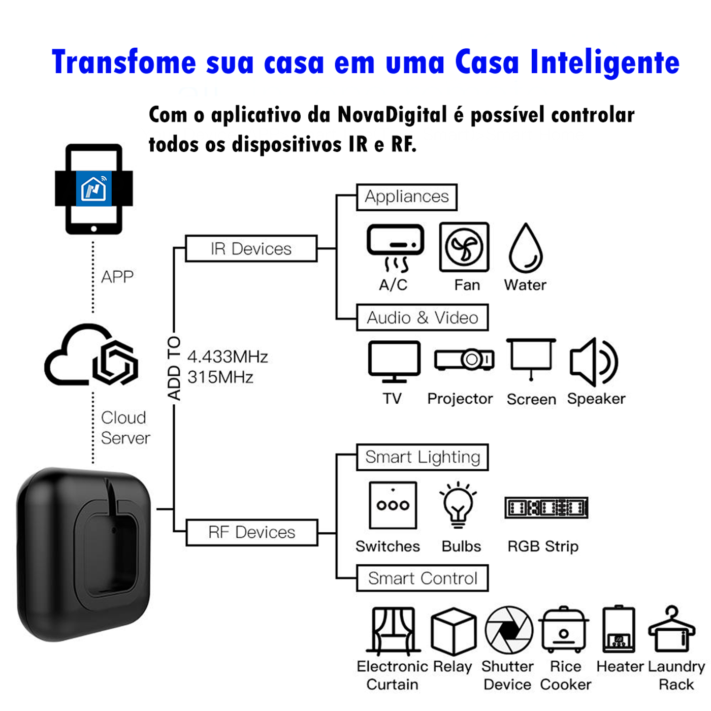 O controle inteligente IR e RF te permite controlar diversos equipamentos, ele copia controles que possuem rádio frequência ou infravermelho como por exemplo ar condicionado, televisão, aparelhos de som entre outros.